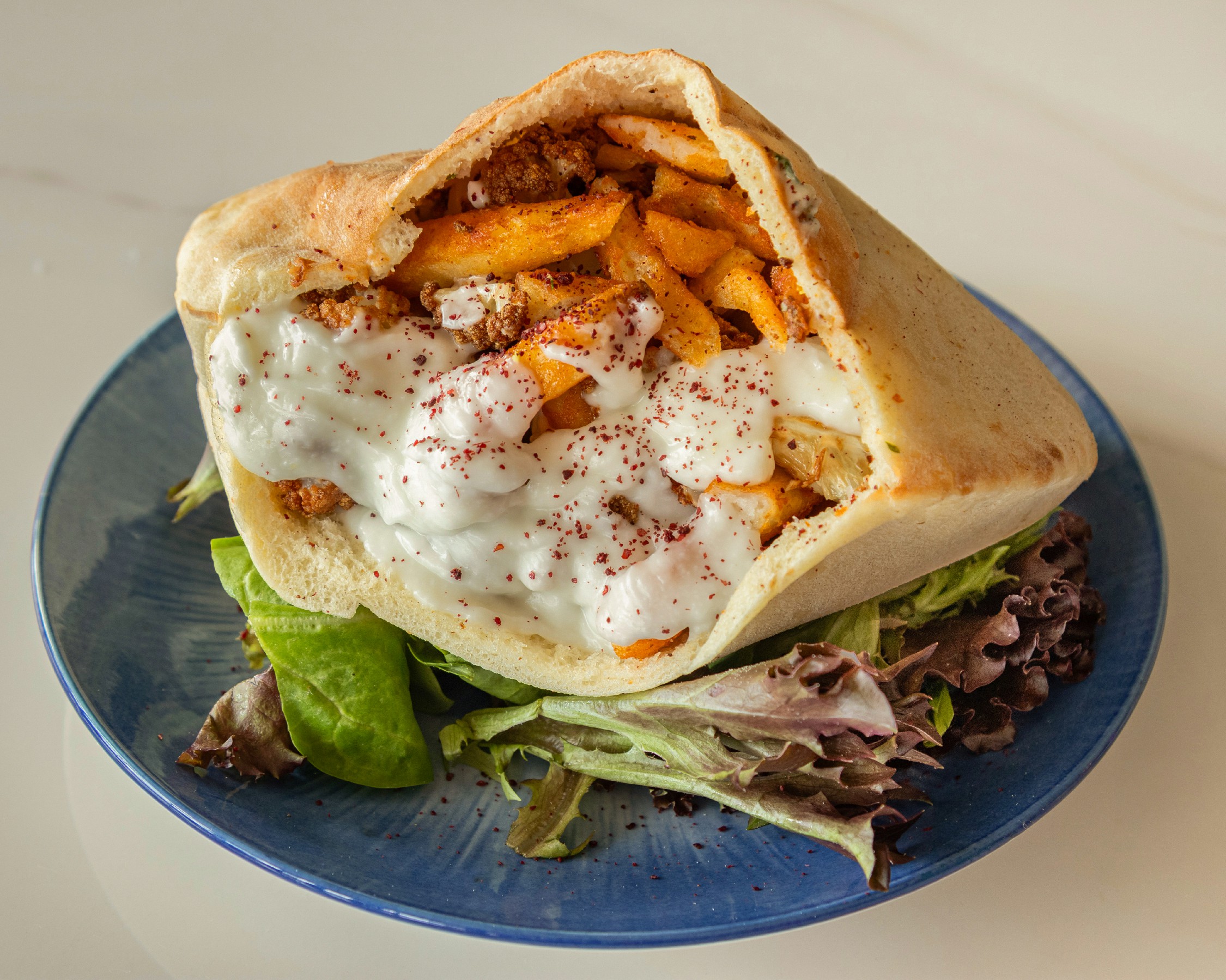 Cauliflower – Hummus – Tomato – Pickles – Lettuce – Tahini Sauce .