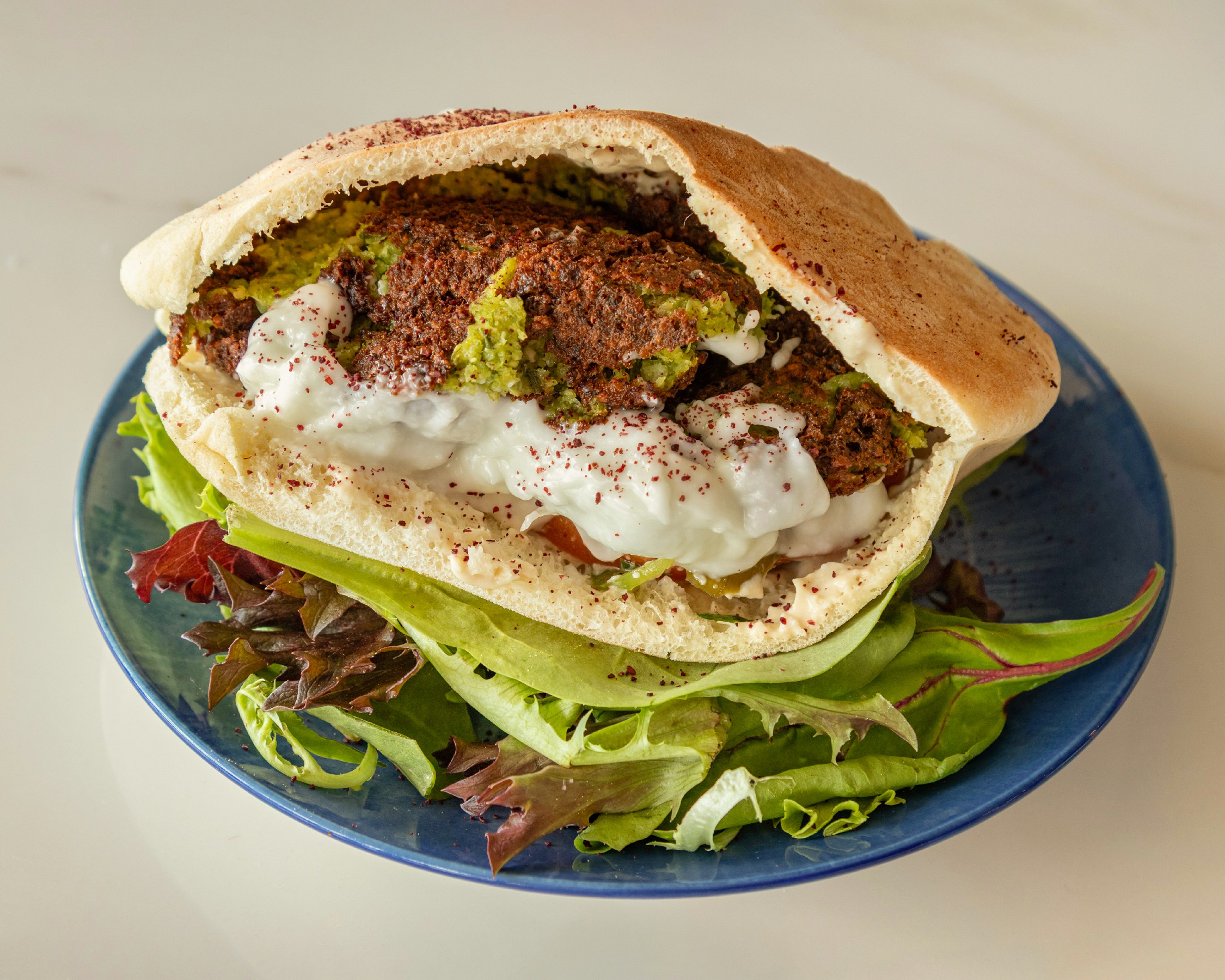 Falafel – Hummus – Tomato – Pickles – Red Cabbage – Tahini Sauce .