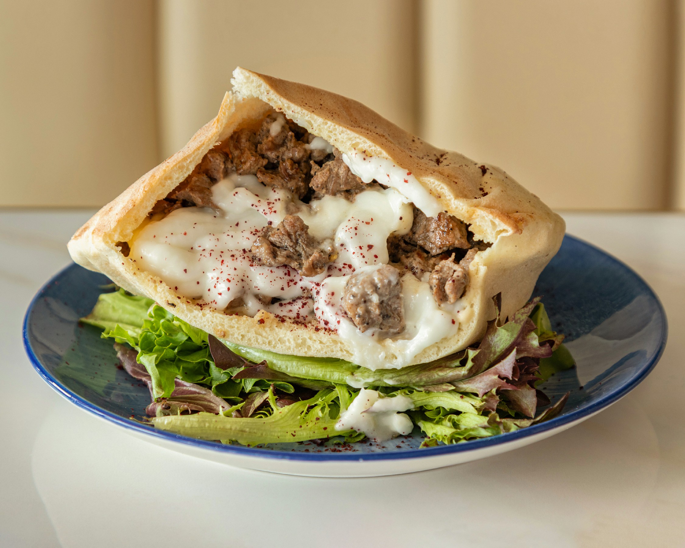 Lamb – Hummus – Tomato – Pickles – Sumac Onions – Tahini Sauce .